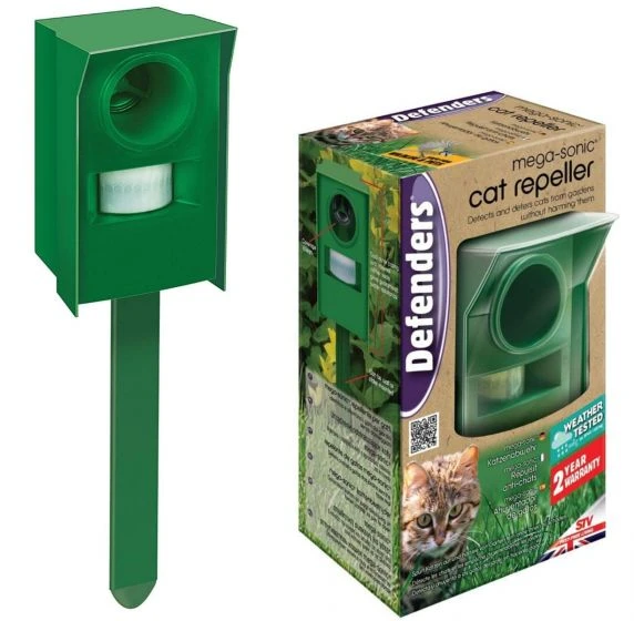 The Mega-Sonic Cat Repeller detects and deters cats from gardens without harming them.
