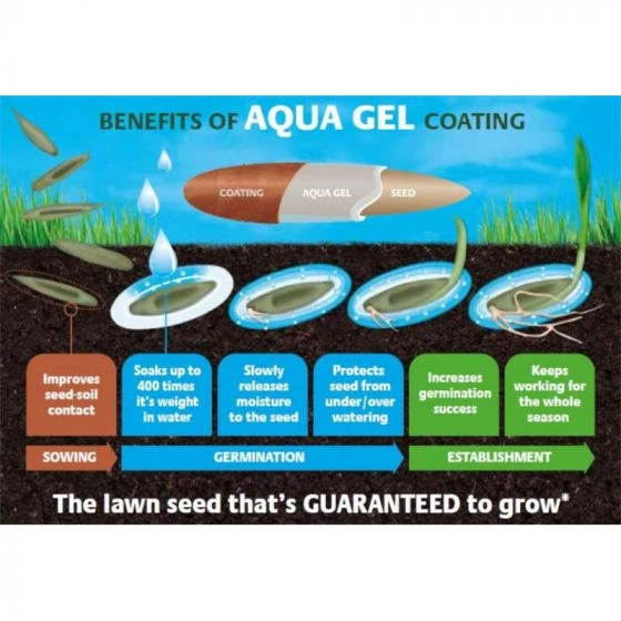 Seeds are treated with Aqua Gel technology for improved germination. Aqua Gel can absorb 400 x its weight in water, and slowly releases it back to the seeds, when the seeds require it to germinate. Aqua Gel is also an excellent bird deterrent and contains plant hormones to stimulate growth.